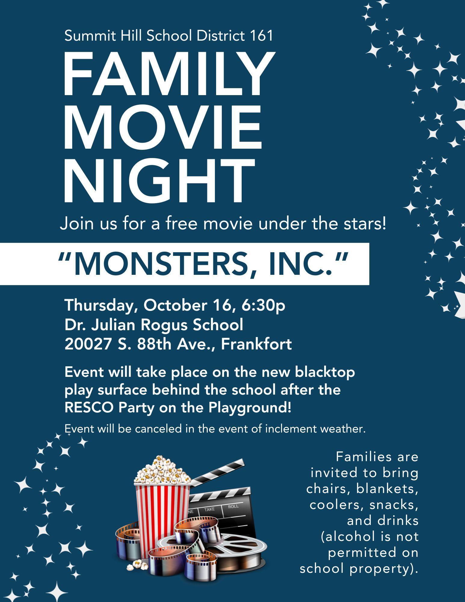 All SHSD161 families are invited to join us for a FREE Movie Under the Stars on Thursday, October 16, at 6:30p on the new blacktop play surface behind Dr. Julian Rogus School! The Family Movie Night will feature “Monsters, Inc.” Attendees are welcome to bring chairs, blankets, coolers, snacks, and drinks (please note that alcohol is not permitted on school property). The event will be canceled in the event of inclement weather.