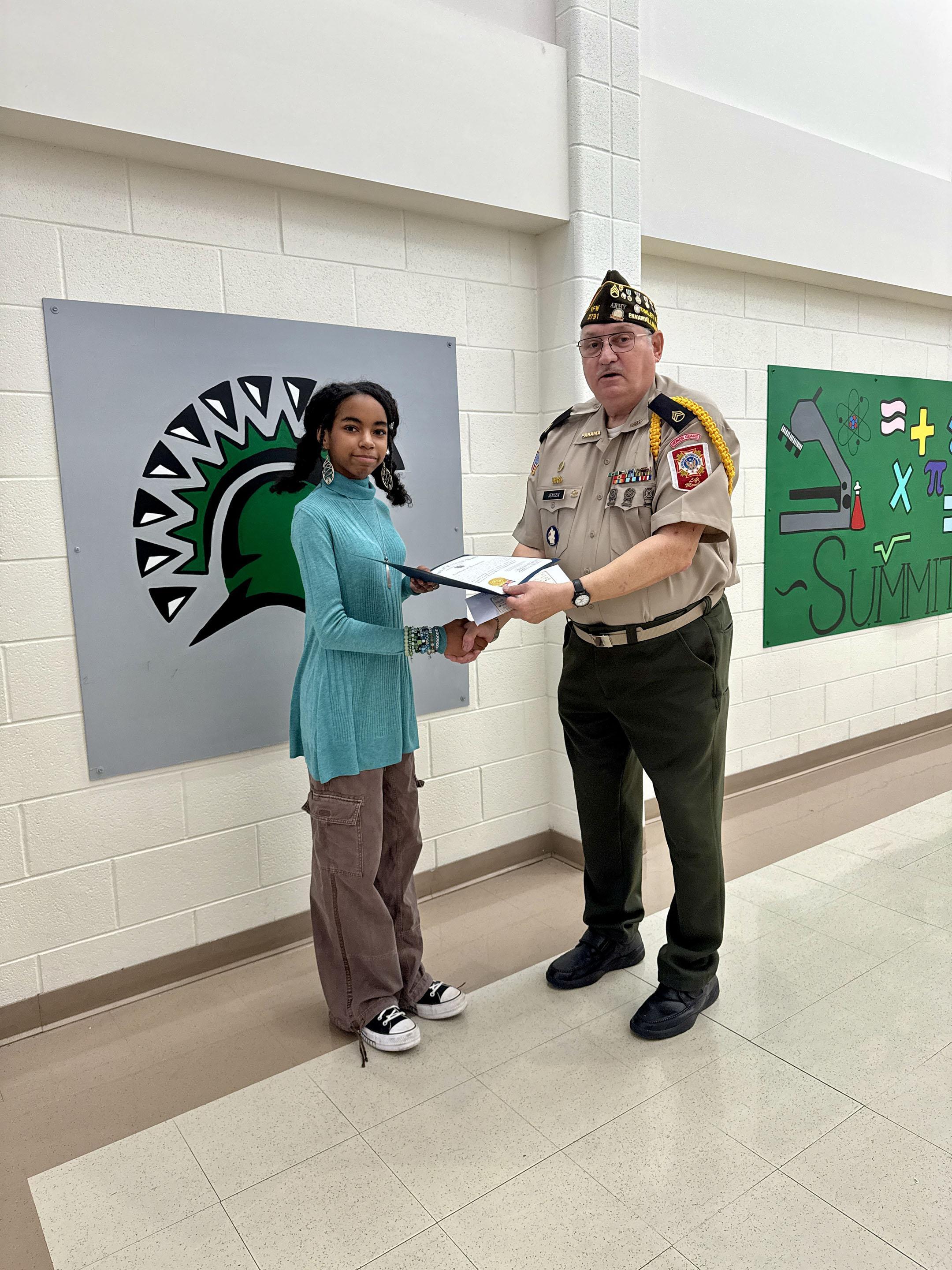 Congratulations to Summit Hill Junior High seventh grader Chloe Stanford on writing the Best Seventh Grade Essay in the Tinley Park VFW’s Patriot’s Pen Youth Essay Contest and advancing to the district level! Stanford was presented with a certificate, medal, and check by Robert Jensen from the Tinley Park VFW.